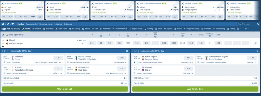 Many universal markets also work well for cricket, offering a simple way to interpret a match without deep statistical knowledge. 1xBet users can combine these selections with more precise cricket specials for balanced betting slips.